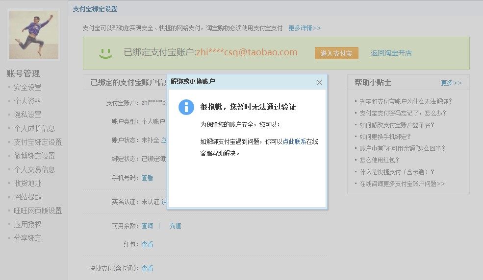 亲,如您解绑支付宝时遇到以下弹框页面,提示 【暂时无法通过验证】,请您点击这里寻求在线客服的帮助。