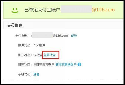 激活支付宝账户操作路径:登录淘宝网,点击页面右上角【我的淘宝】 — 【账户设置】 — 【支付宝绑定设置】 — 【立即补全】