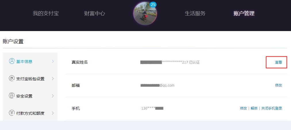 打开https://www.alipay.com/ ,登录支付宝账户,在【账户设置】—【基本信息】,真实姓名一项显示的是身份证号码和【查看】按钮,即表明已通过实名认证。(点击查看是否通过实名认证)
