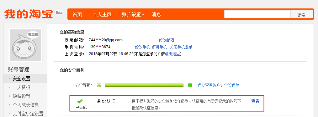 登录您的淘宝账号,点击 【我的淘宝】 — 【账户设置】 ,在 【安全设置】 里即可看到您的身份认证情况,如果现实的是 【已完成】 和 【查看】 按钮,即表明已通过实名认证。(点击查看是否通过实名认证)