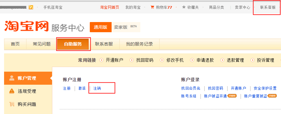 如果您已经深思熟虑,确定放弃账户,请点击淘宝网页右上角【联系客服】-【自助服务】-【账户管理】尝试注销。